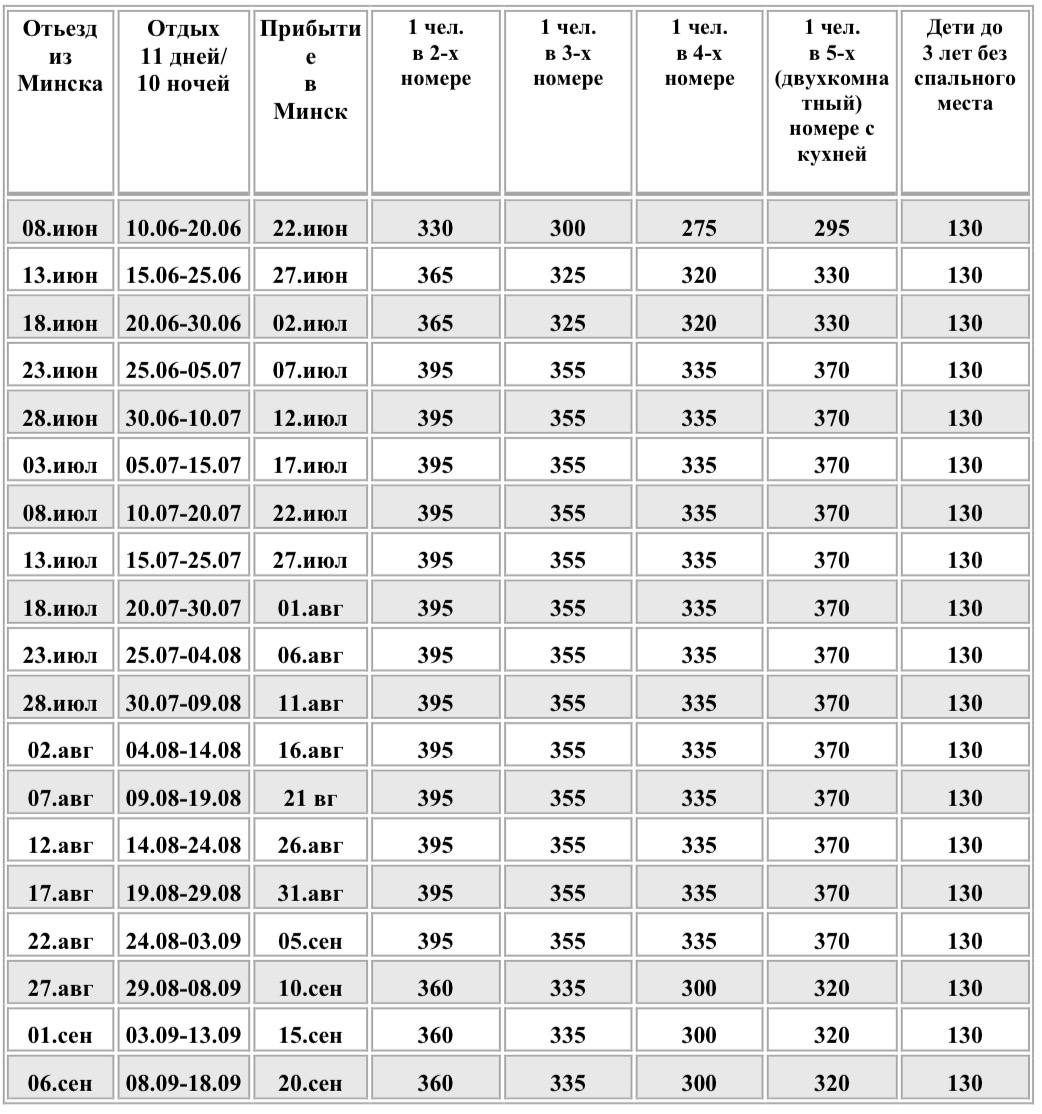 *Стоимость в таблице указана на 1 человека в условных единицах в ознакомительных целях, оплата осуществляется на территории РФ.