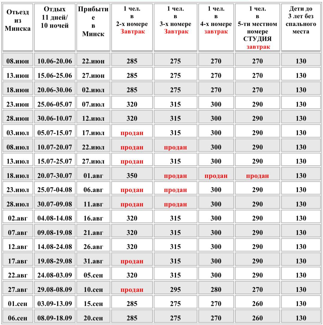 *Стоимость в таблице указана на 1 человека в условных единицах в ознакомительных целях, оплата осуществляется на территории РФ.