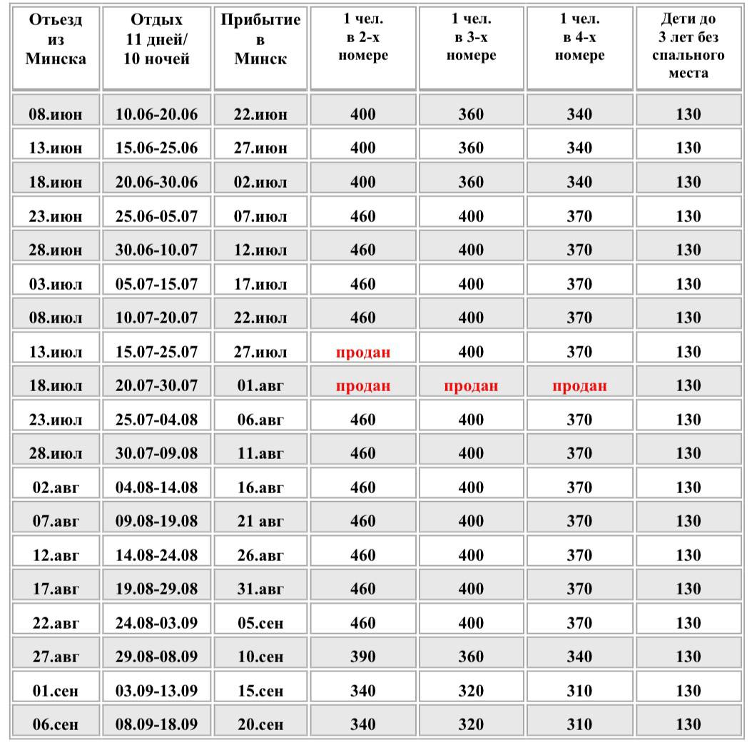 *Стоимость в таблице указана на 1 человека в условных единицах в ознакомительных целях, оплата осуществляется на территории РФ.