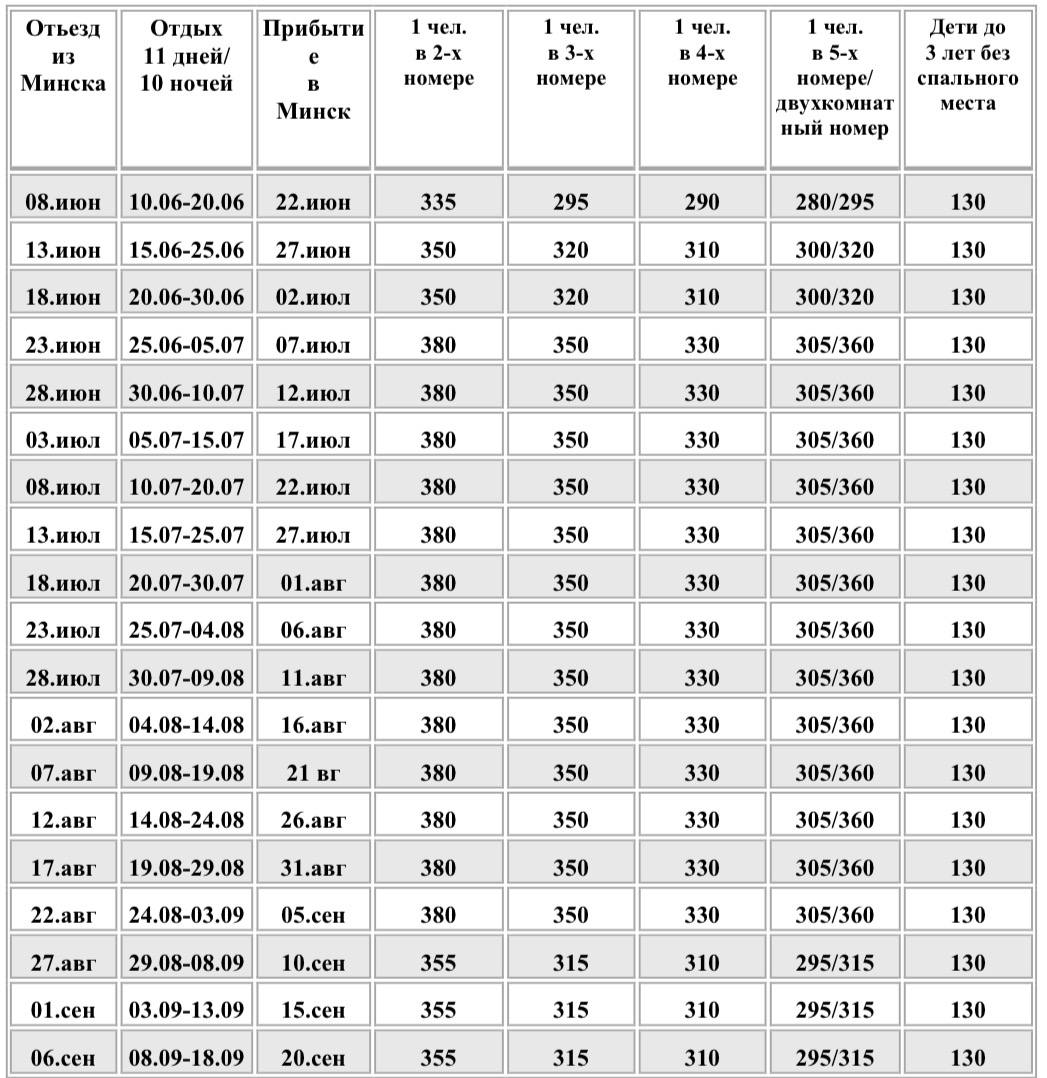 *Стоимость в таблице указана на 1 человека в условных единицах в ознакомительных целях, оплата осуществляется на территории РФ.
